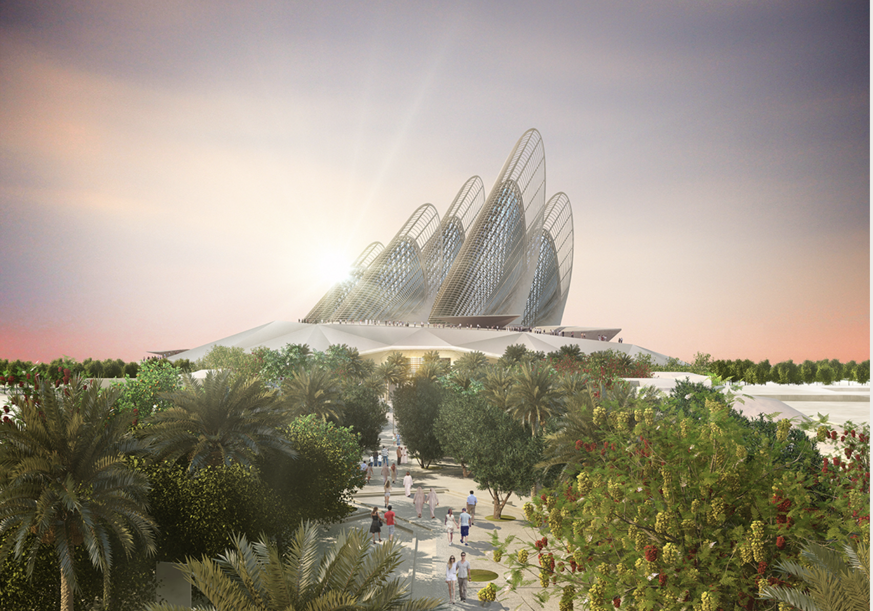 外觀由五座輕量鋼構塔組成,弧形設計象徵鳥翼升起,亦具熱煙囪功能,可利用煙囪效應導入冷風至下方展廳,有效應對當地高溫乾燥氣候