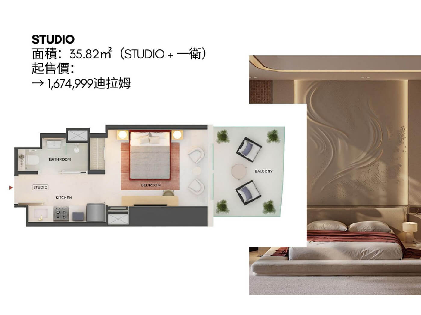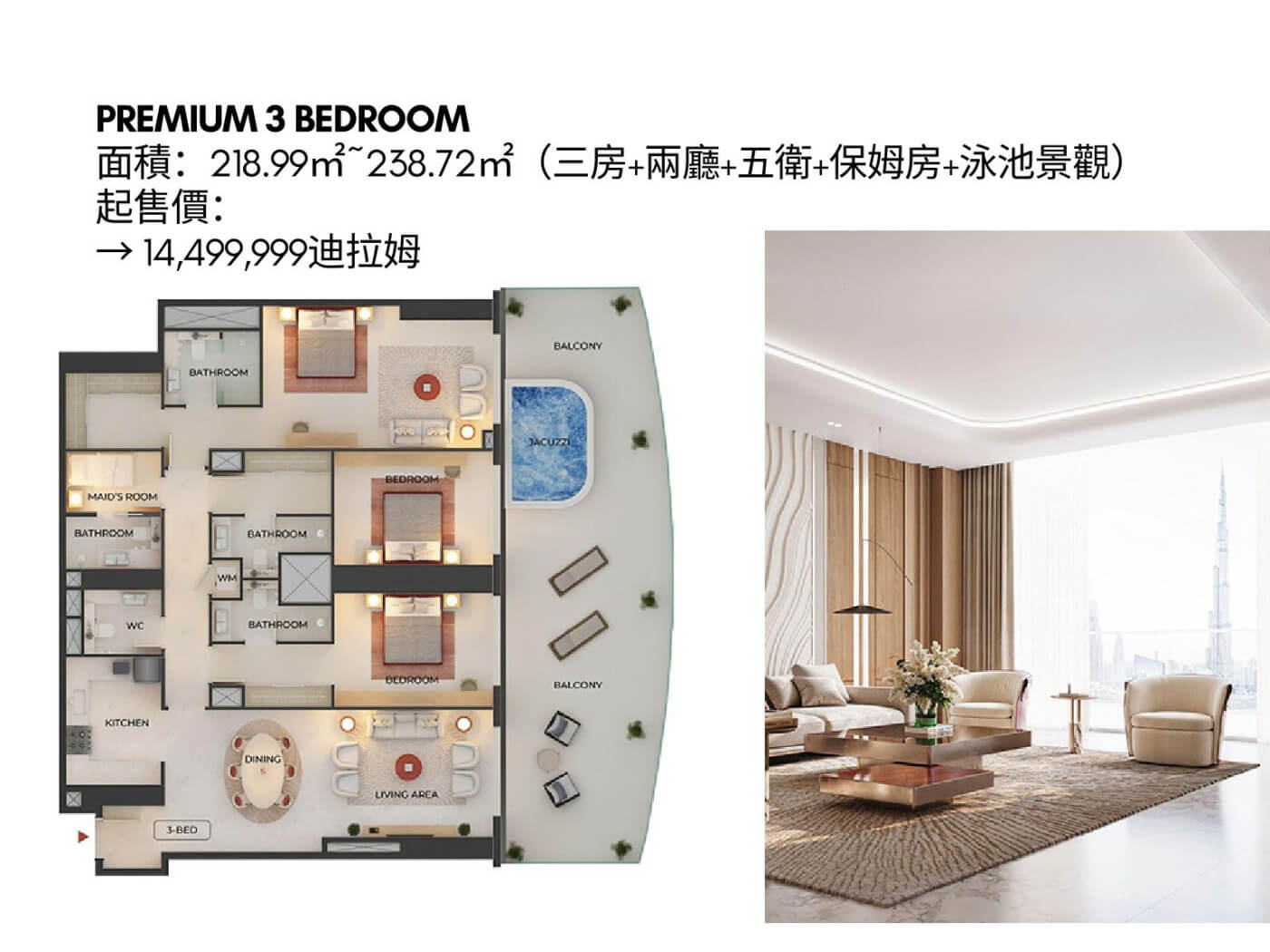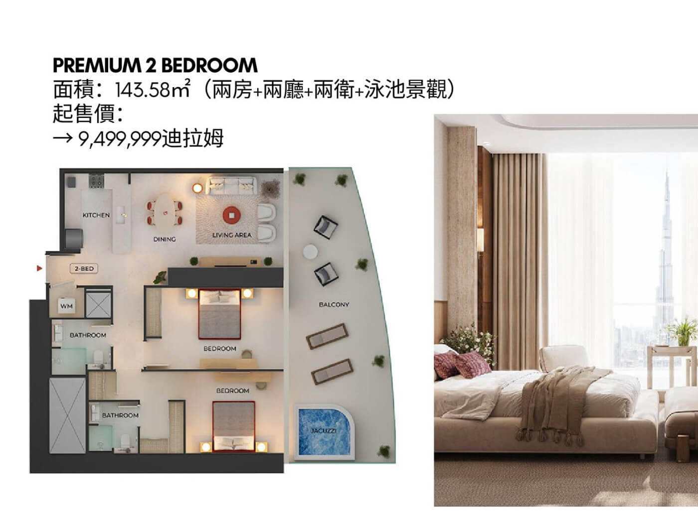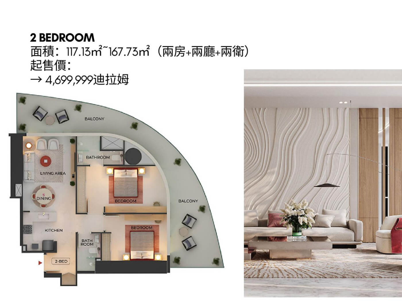 | 售價 | AED167萬起 | 付款方式 | 提供 60/40 或 70/30 彈性付款計畫 |