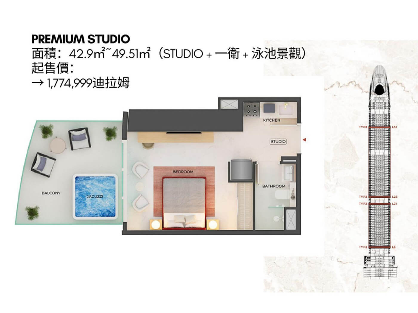 | 戶型規劃 | Studio:開放式套房 Premium Studio:尊享型開放式套房 1 BR Royal Suite:一臥室皇家套房 2 BR:兩臥室公寓 2 BR Royal Suite:兩臥室皇家套房 3 BR Royal Wing:三臥室皇家翼公寓 |